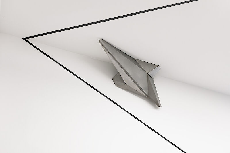 Dem gegenüber stehen die skulpturalen Arbeiten Leidenbergers aus geschweißtem Edelstahl. Ihre klar gefassten, spitz zulaufenden Volumina wirken wie dreidimensionale Entsprechungen der grafischen Intervention. Die Skulpturen scheinen aus der Wandzeichnung hervorzutreten, als seien sie aus den Linien heraus in den Raum gekippt. Trotz des massiven Materials entfalten sie eine schwebende Leichtigkeit, da sie nur punktuell auf dem Boden aufliegen und ihre spitzen Kanten wie Pfeile in verschiedene Richtungen weisen.