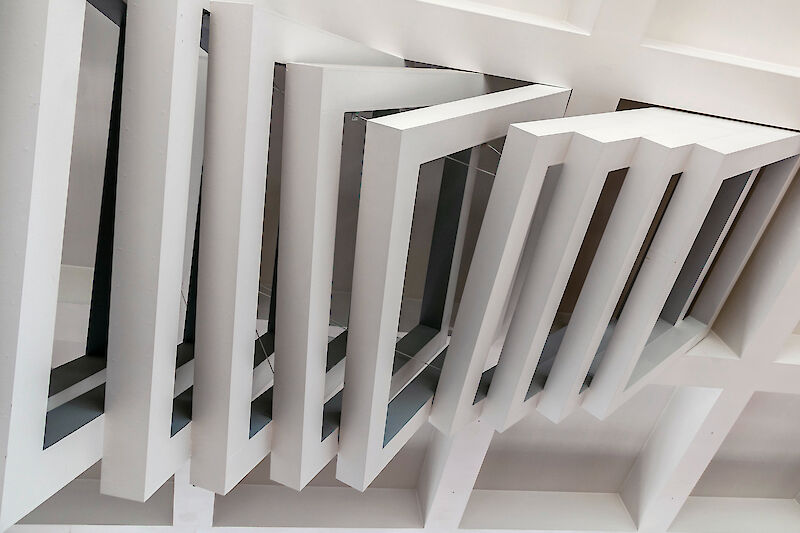 Die symbolische Ebene ist dabei kaum zu übersehen: Zwischen Kassette und Zarge entfaltet sich eine Spannung, die für Übergänge, Entwicklungen und Lernprozesse steht. Für die Studierenden, die täglich diesen Raum durchschritten, stellte die Arbeit einen ästhetischen Impuls dar, der den Alltag unmerklich begleitete. Sie fungierte als eine Art visuelle Metapher für den Weg vom Fragment zur Ganzheit, vom Stillstand zur Veränderung.