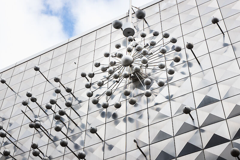 Die nahezu gesamte Fassade oberhalb der Schaufensterzone wurde mit quadratischen Edelstahlplatten verkleidet, deren pyramidenartige Struktur das Licht facettiert reflektiert. In diese spiegelnde Oberfläche setzte Piene eine Vielzahl von Aluminiumkugeln auf Stäben, die sich um ein zentrales rotierendes Element gruppierten. Ursprünglich waren die Kugeln beleuchtet und bewegten sich in einem eigens programmierten Ablauf. Das Zusammenspiel aus Licht, Reflexion und Rotation verwandelte die Fassade bei Tag und Nacht in eine pulsierende, fast kosmische Lichtmaschine – eine „Skulptur des Lichts“, die weit über die Straße hinaus strahlte.